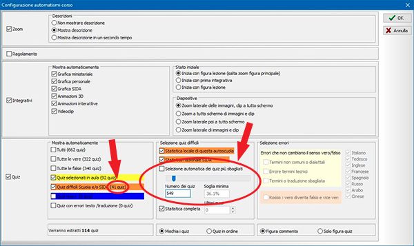 A questo punto si attivano tutte le funzioni che consentono di personalizzare la selezione dei quiz difficili, che verranno proiettati in base alla selezione scelta.