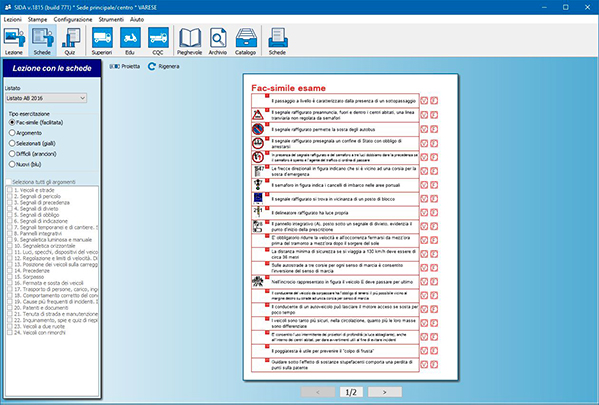 - il tipo di esercitazione (scheda fac-simile esame; per argomento; con quiz selezionati dall'insegnante - gialli -; con quiz difficili - arancioni - o, in caso di entrata in vigore di nuovi quiz, con i quesiti nuovi, identificati in blu).