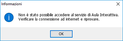 Pertanto, prima di iniziare la lezione con "aula interattiva", SIDA verifica la connessione del pc aula. Una finestra darà il messaggio relativo allo stato della connessione. Se, a seguito della verifica, la connessione risulta assente per almeno un minuto, si potrà effettuare la tradizionale lezione in aula, ma non sarà possibile utilizzare "aula interattiva".