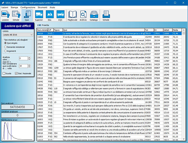 Il docente sta lavorando sul listato della patente A e B 2016 (voce Listato nell'immagine) Il docente sta esaminando i singoli quiz, ovvero le singole affermazioni più sbagliate di tutto il listato ministeriale per la patente A e B (voce "Quiz singolo" nell'immagine) Il docente sta lavorando sulla base della statistica nazionale (casella Stat. Nazionale spuntata) Infatti i quiz analizzati per la statistica sono 647.034.058 (voce "quiz analizzati") |