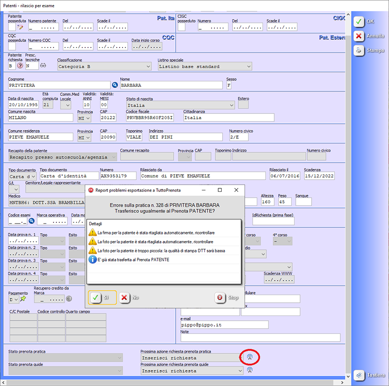 Dopo aver premuto il pulsante indicato nella maschera, prima della trasmissione vera e propria, vengono eseguiti tutti i controlli del caso, gli stessi che vengono eseguiti nella procedura di esportazione presente nel tabellone (disco PATENTE). Premendo "Si" la pratica viene trasmessa.