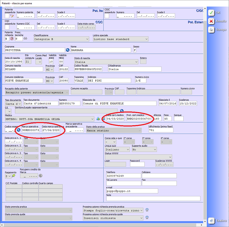 Modificata la maschera di inserimento PrenotaPatente (Esami/Duplicati/Conversioni) per la gestione del campo "Protocollo certificato medico". La compilazione di questo campo (evidenziato nell'immagine di seguito) comporta una trasmissione dello stesso a TuttoPrenota, il quale sarà in grado di selezionare il corretto web service in fase di invio.