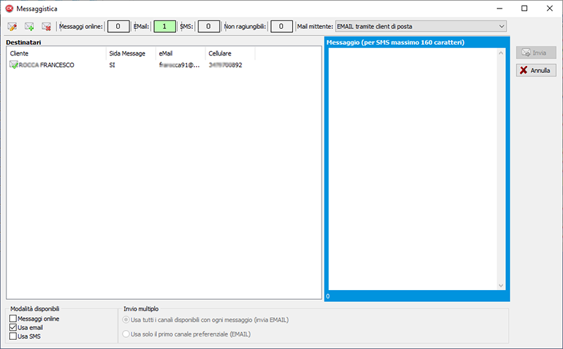 Si aprirà la finestra di messaggistica. È possibile notare che è presente una voce aggiuntiva, ovvero la mail del mittente che mostrerà un elenco delle mail configurate su Gestione nelle impostazione viste prima.
