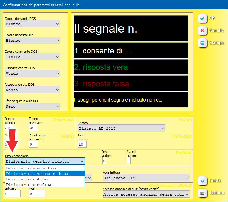 La configurazione del tipo di vocabolario da utilizzare si può effettuare, oltre che dal modulo quiz, anche dalla maschera di configurazione dei parametri generali nel modulo aula (menu configurazioni; parametri generali quiz), selezionando l'opzione desiderata nella casella "tipo vocabolario" e confermando on OK.