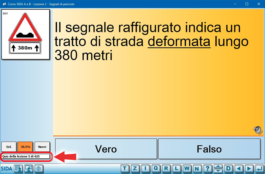 Quindi, ad esempio, in questa immagine il quiz proiettato è il numero 13 di 425 quiz totali presenti nella lezione dei segnali di pericolo.