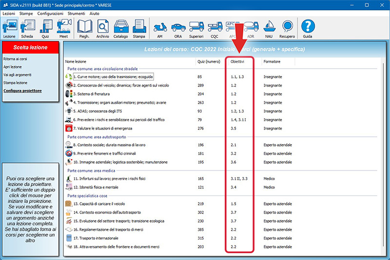 Ricordiamo che è possibile vedere tutti gli obiettivi in SIDA Aula dalla pagina delle lezioni del corso CQC, visualizzando le "icone con dettagli", come in figura.