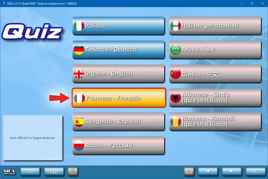 Allo stesso modo, nel modulo quiz, selezionare all'accesso la lingua francese per svolgere i quiz.