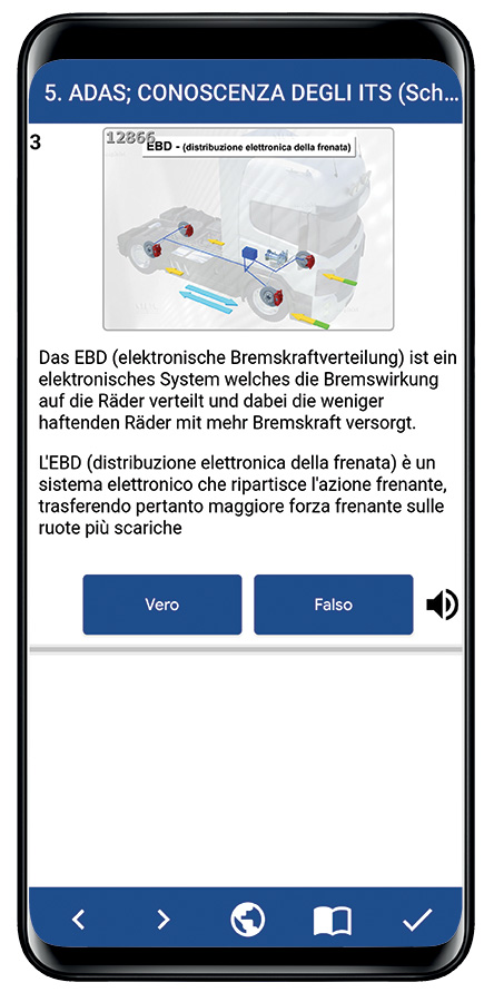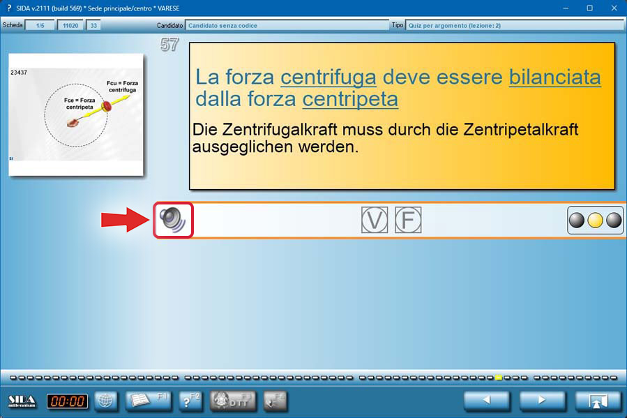 Dopo aver selezionato la lingua desiderata (italiano, francese o tedesco), cliccando sull'icona dell'altoparlante (sia nel listato in aula, sia durante le esercitazioni quiz su terminale o app) è possibile ascoltare l'audio del listato CQC nella lingua straniera scelta (francese o tedesca).