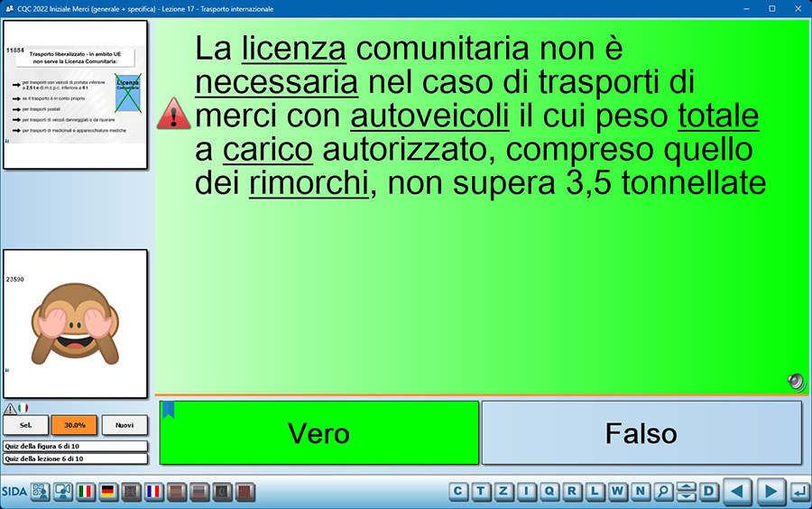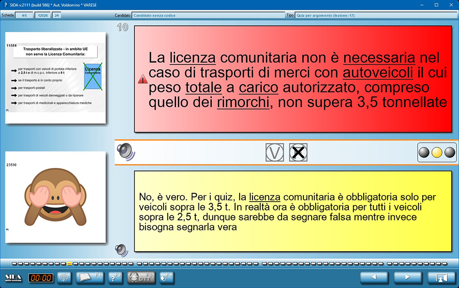 Abbiamo segnalato la criticità di alcuni quiz che contengono inesattezze inserendo, oltre al consueto triangolino rosso, anche l'immagine di una scimmietta. È un modo simpatico per attirare l'attenzione degli allievi sul fatto che quel quiz non ha una formulazione in linea con l'attualità e che richiede quindi una maggiore attenzione durante l'esame. Ecco un esempio di come la scimmietta viene rappresentata in aula e nel modulo quiz.