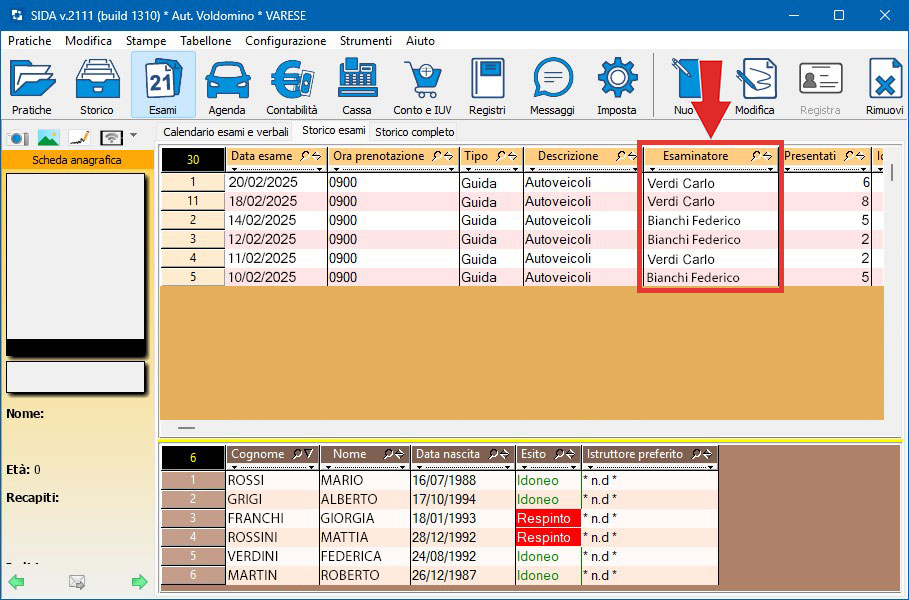 - Storico esami: nella sezione "Esami --> Storico esami" è stata aggiunta l'informazione dell'esaminatore, infatti utilizzando la funzione "Registra esiti da portale" viene registrato anche il nome dell'esaminatore (solo per le sedute svolte).