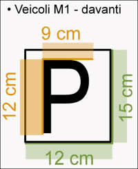 sulla parte anteriore: sfondo rettangolare bianco retroriflettente di altezza 15 cm e larghezza 12 cm, lettera P maiuscola di colore nero di altezza 12 cm e larghezza 9 cm |